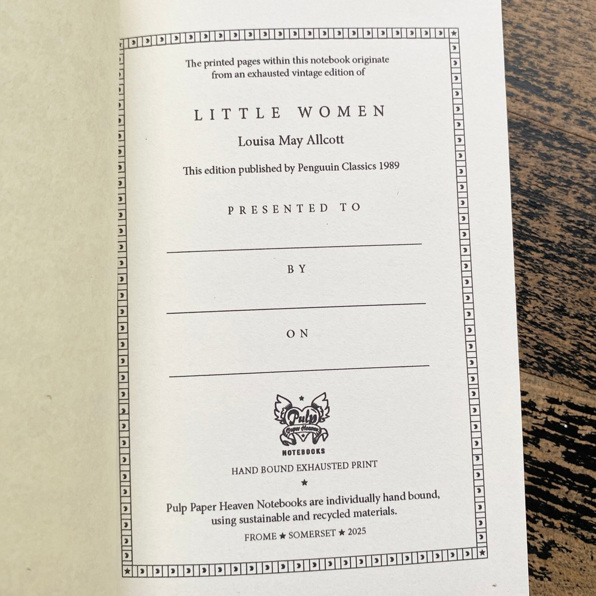 This beautiful notebook is hand bound in premium book cloth and reuses a few chapters from a salvaged paperback copy of 'Little Women' by Louisa May Allcott.